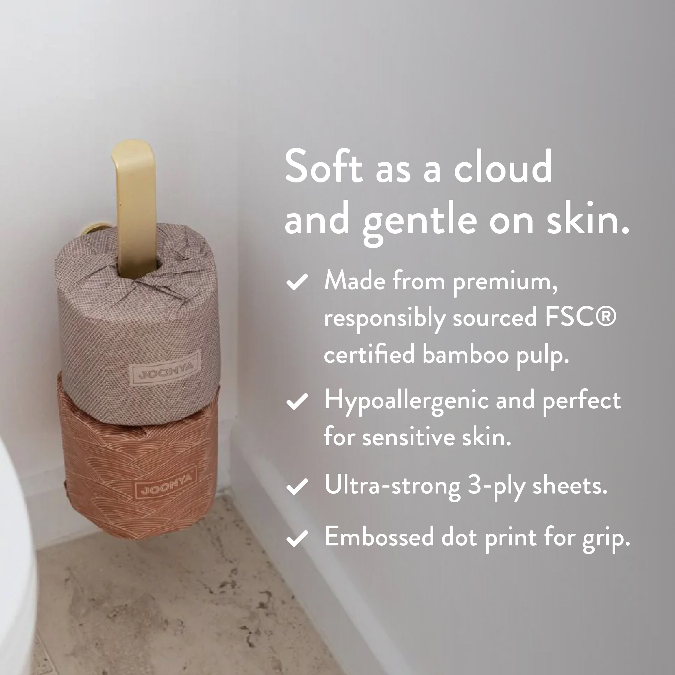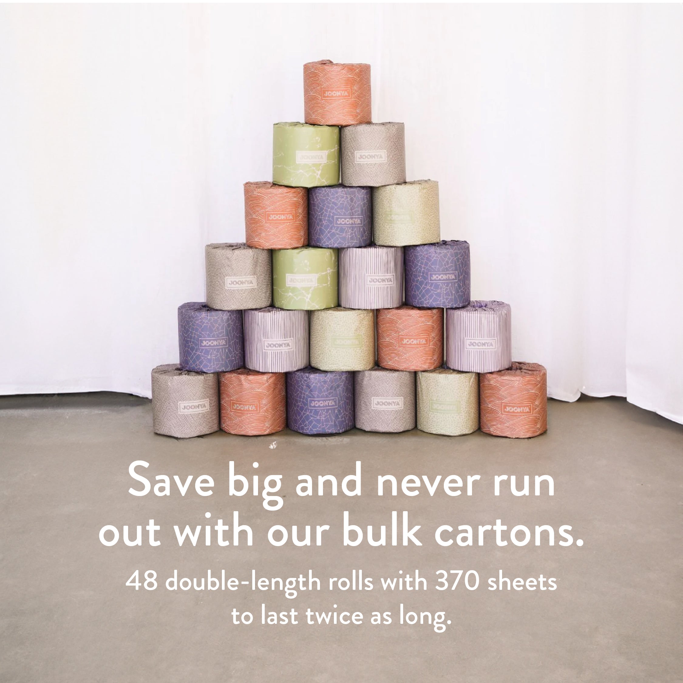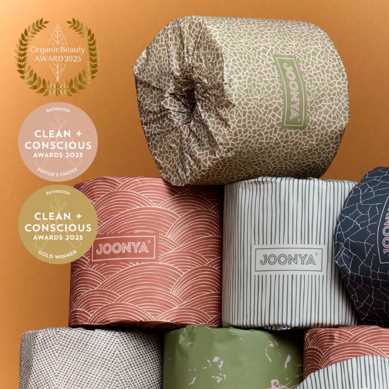 Joonya’s forest-friendly bamboo toilet paper is as gentle on your family’s skin as it is on our world's forests. Our ultra strong toilet paper features double length rolls to last you twice as long, with 370 soft 3ply 4" x 4" sheets. Available in 6 stunning eco-luxe biodegradable wrappers, these aesthetic toilet rolls are designed to be showcased and will enhance any bathroom décor or colour palette.
